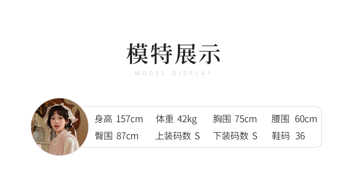 身長:157cm、体重42kg、バスト75cm、ウエスト60cm、ヒップ87cm、試着サイズS