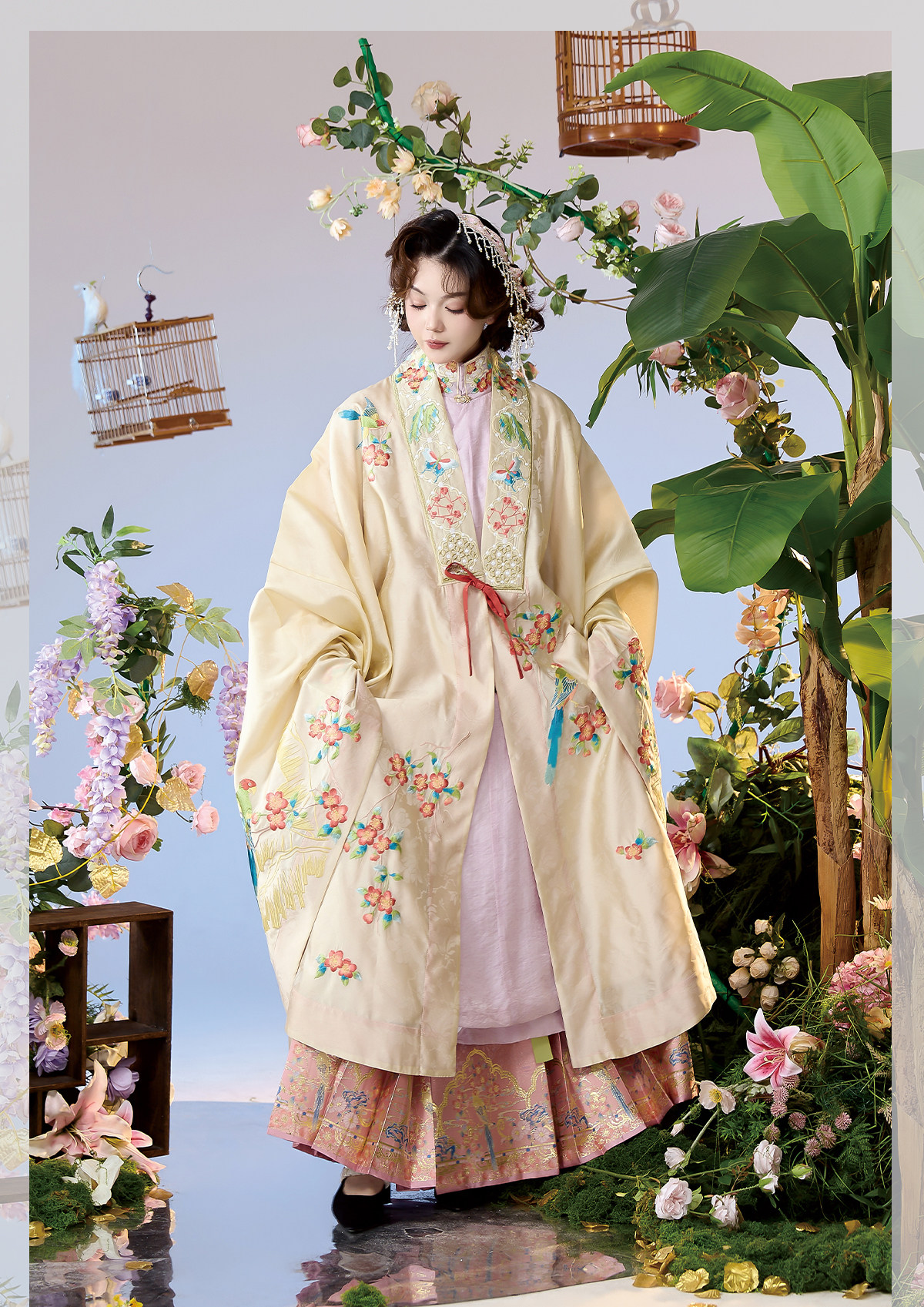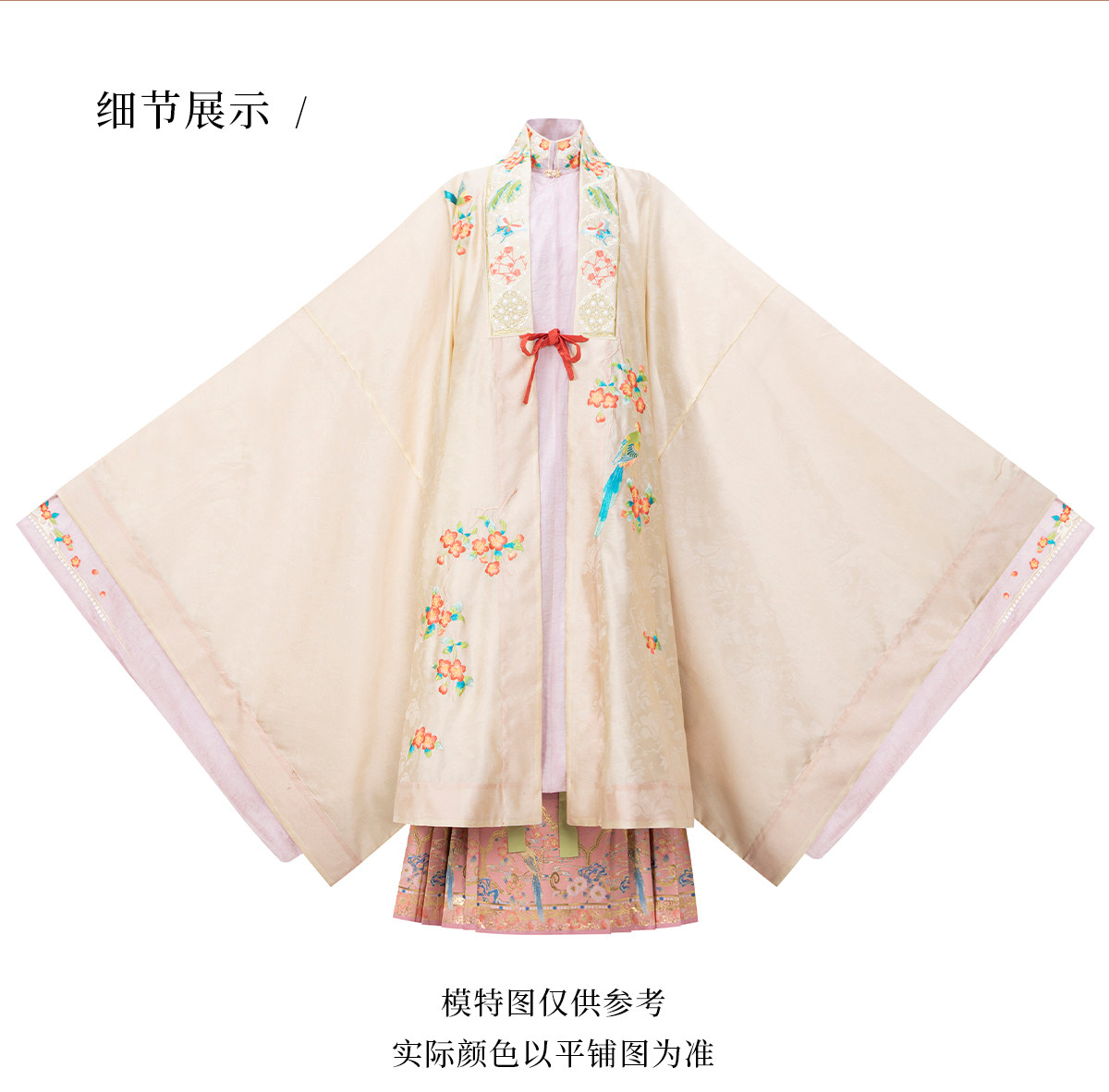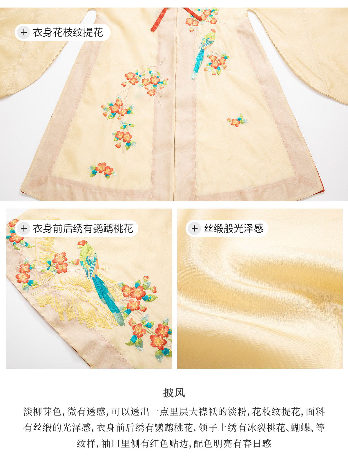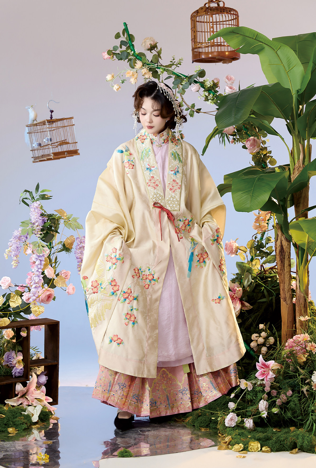 晩明漢服 披風・立ち襟大襟袄・馬面裙 刺繍が彩る春の伝統装 花朝记|花间灵玑鹦鹉
