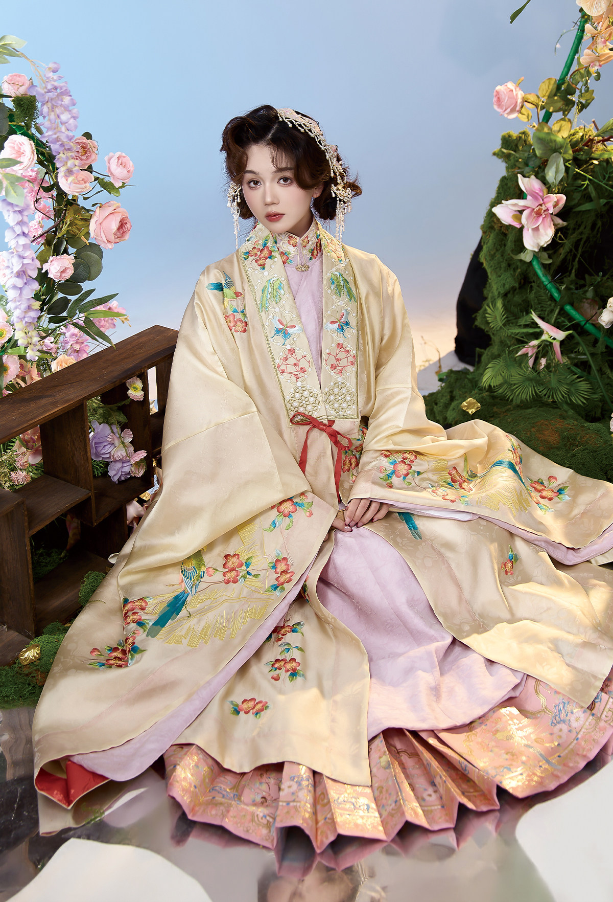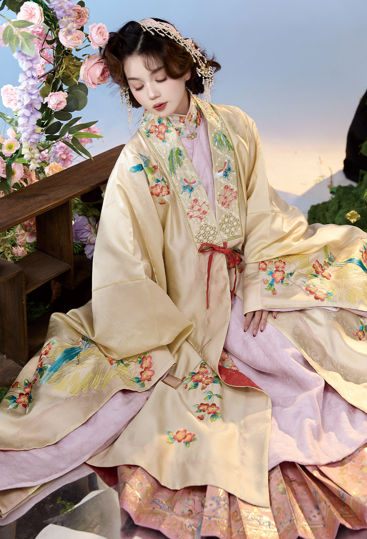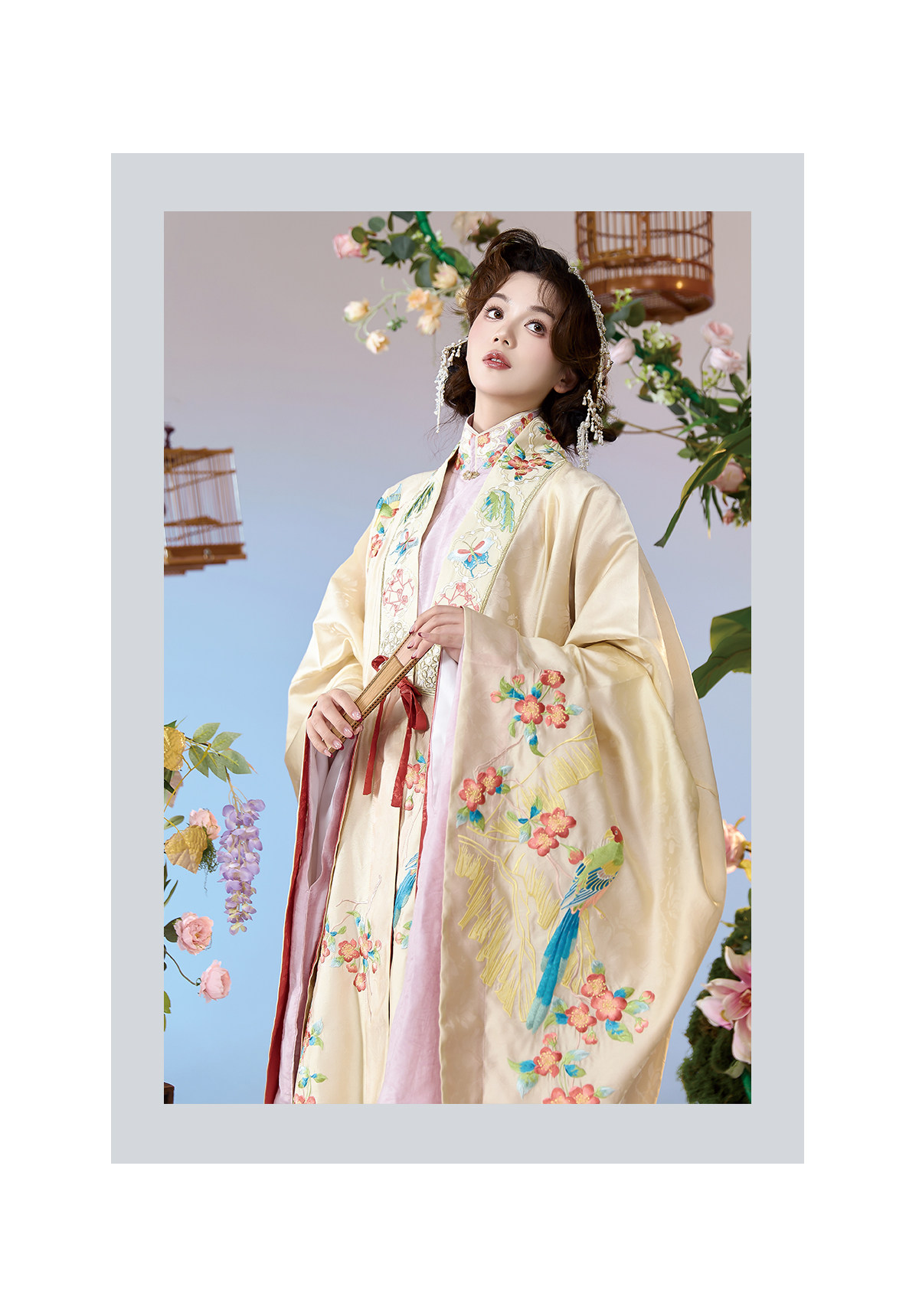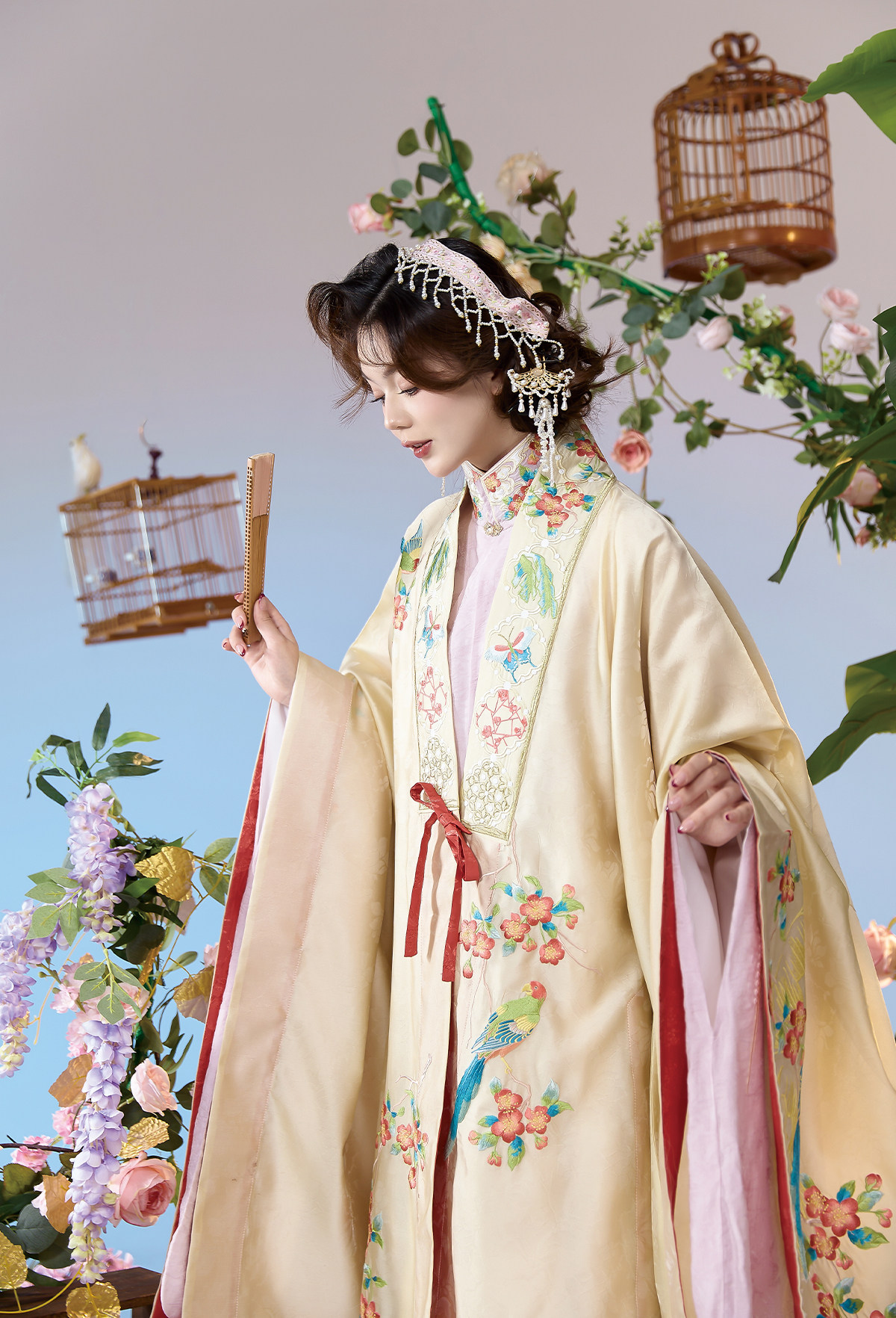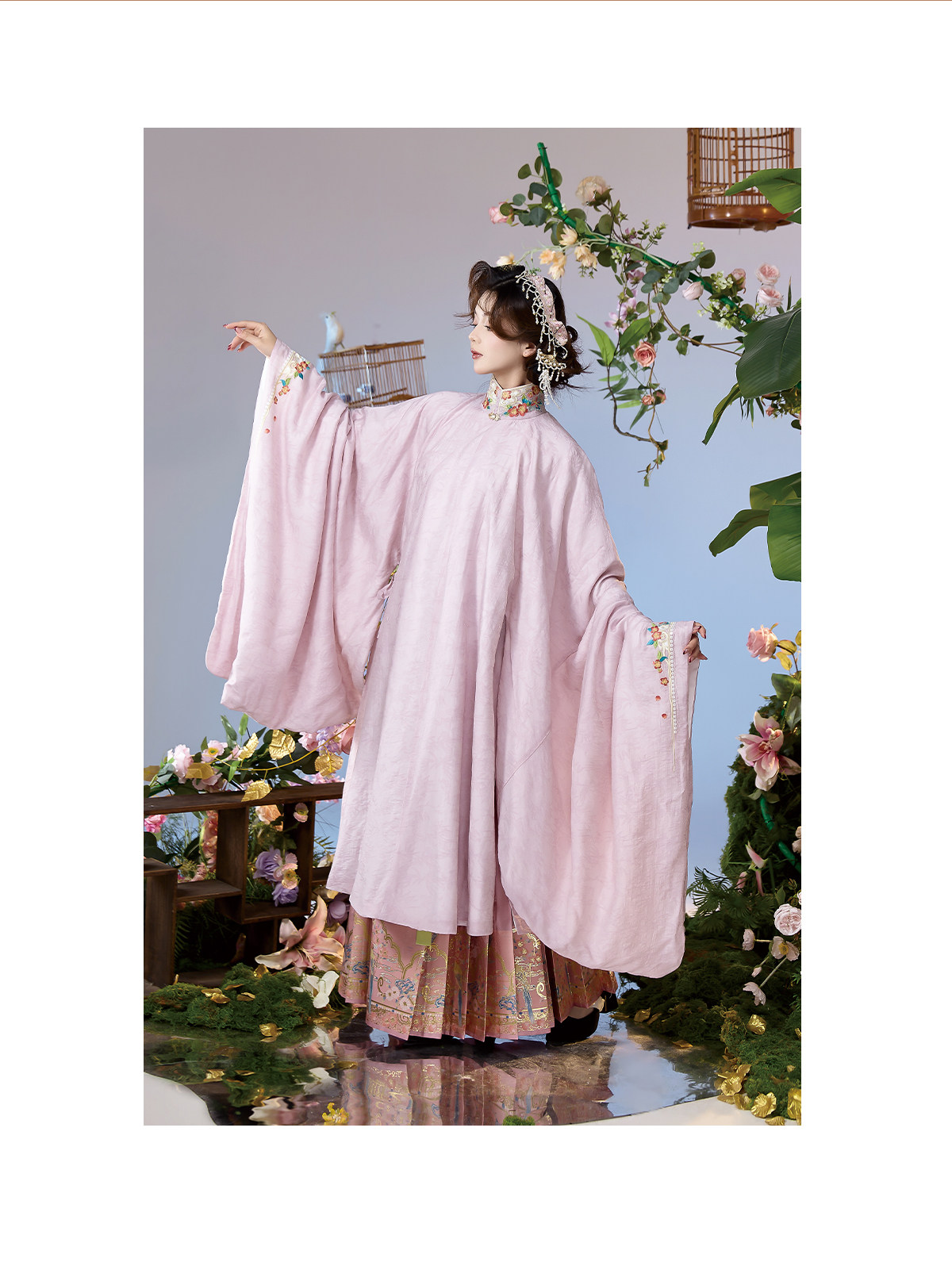 晩明漢服 披風・立ち襟大襟袄・馬面裙 刺繍が彩る春の伝統装 花朝记|花间灵玑鹦鹉