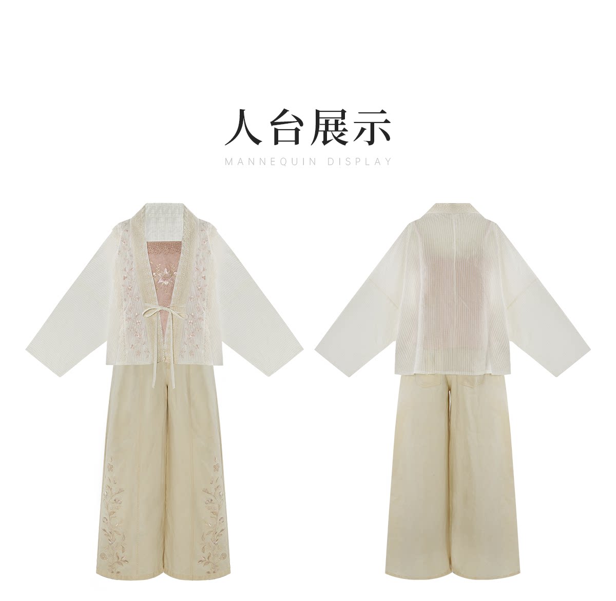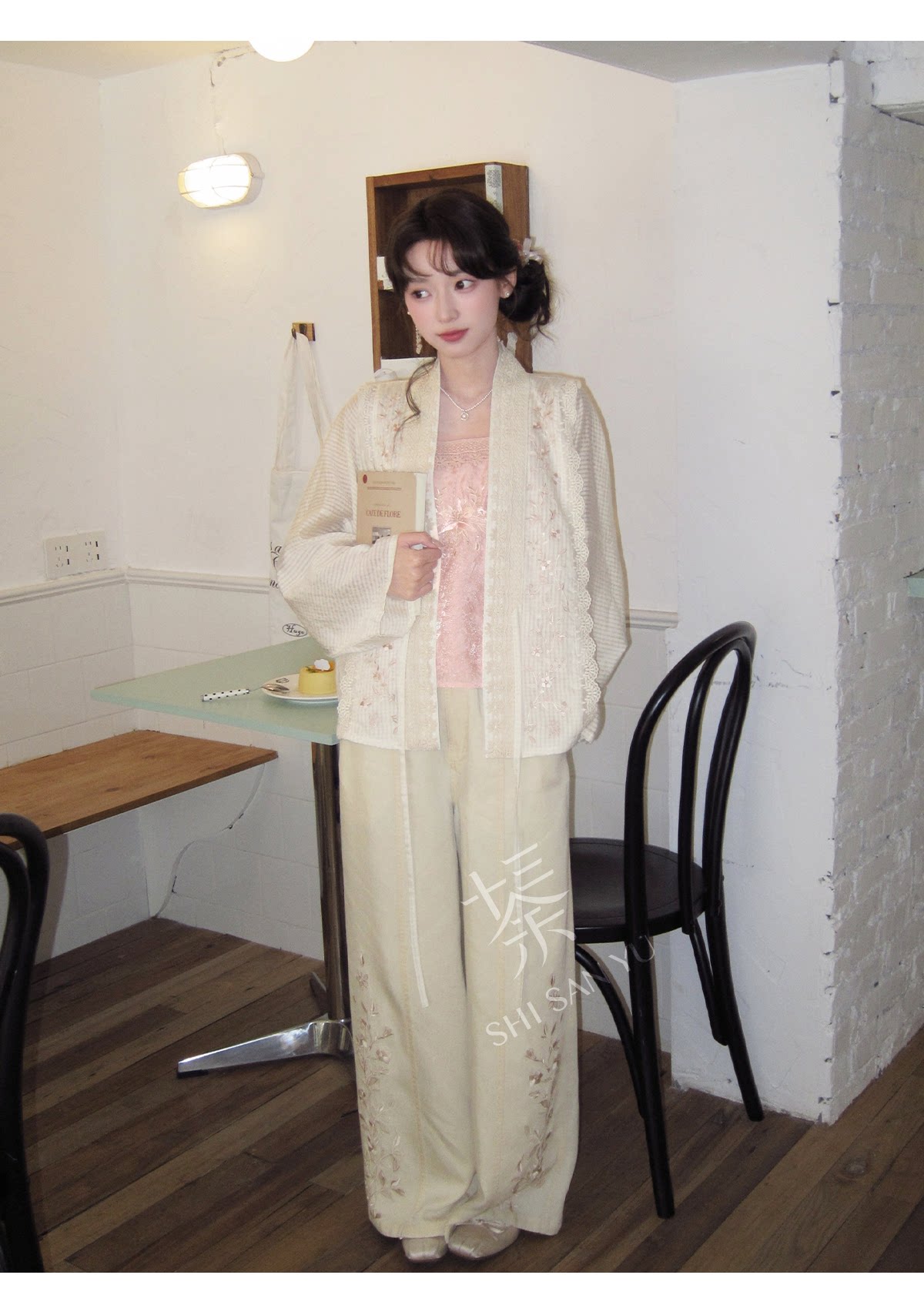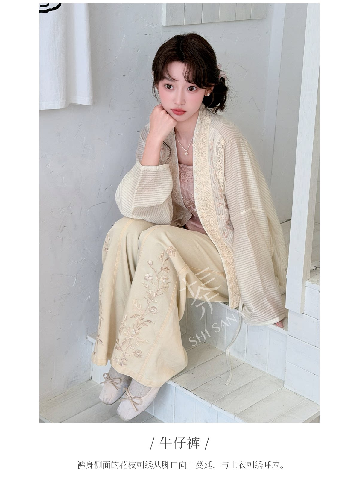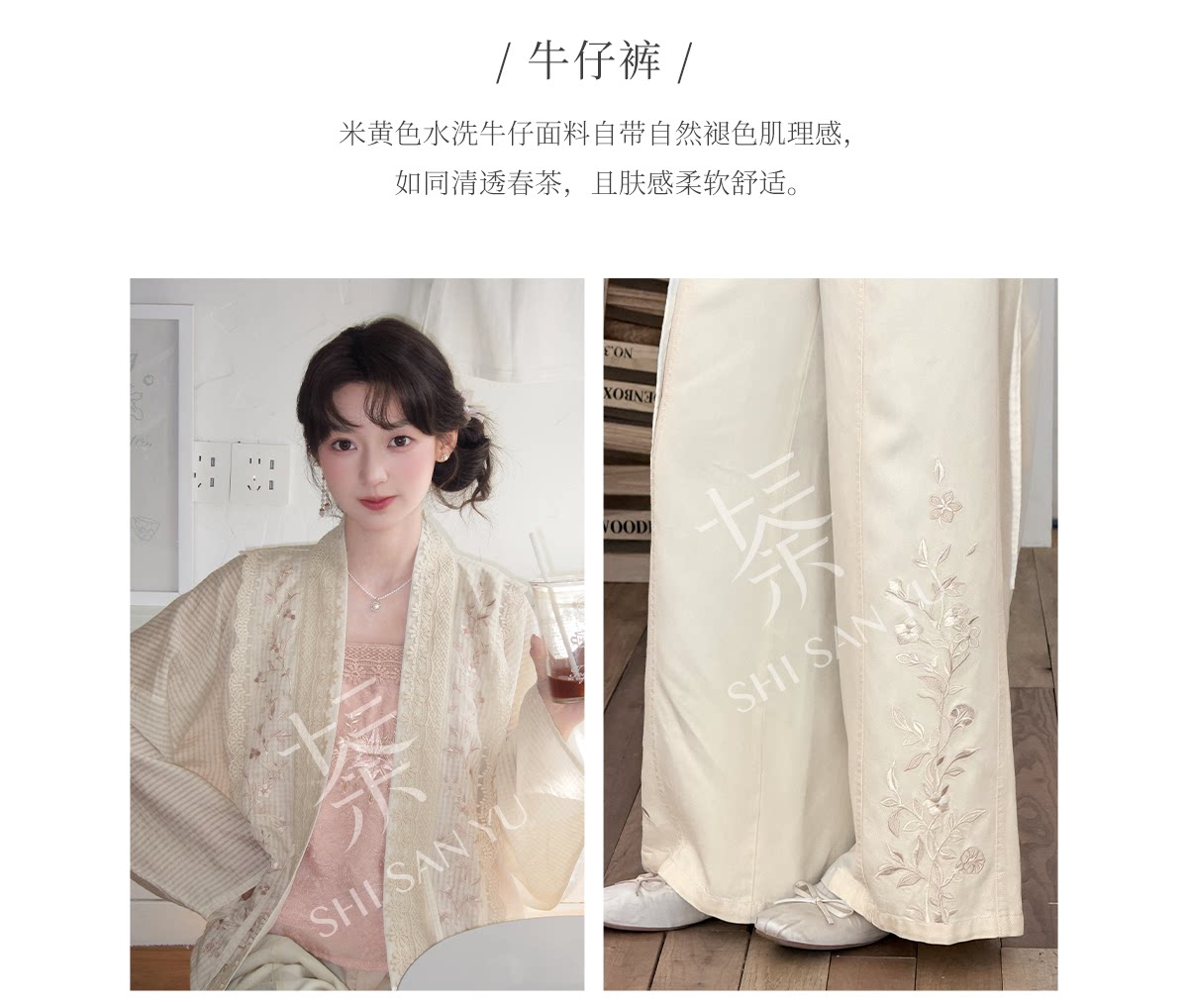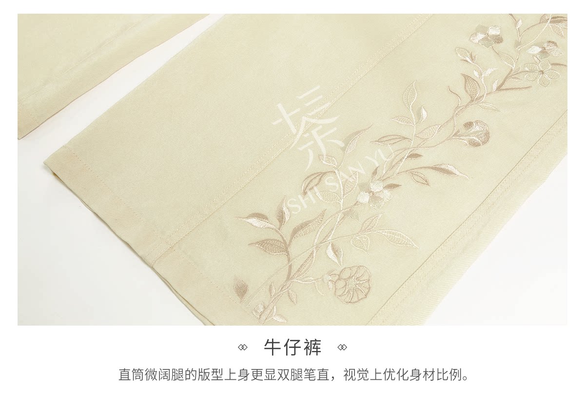 テンセルの対襟トップスとベージュの刺繍デニムワイドパンツ 十三余[雪芽]