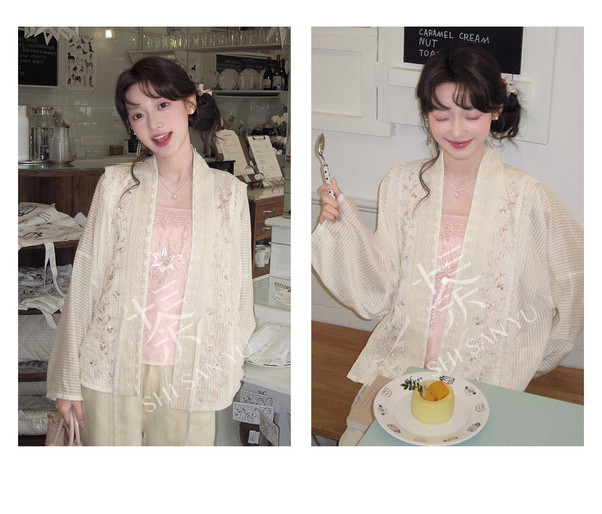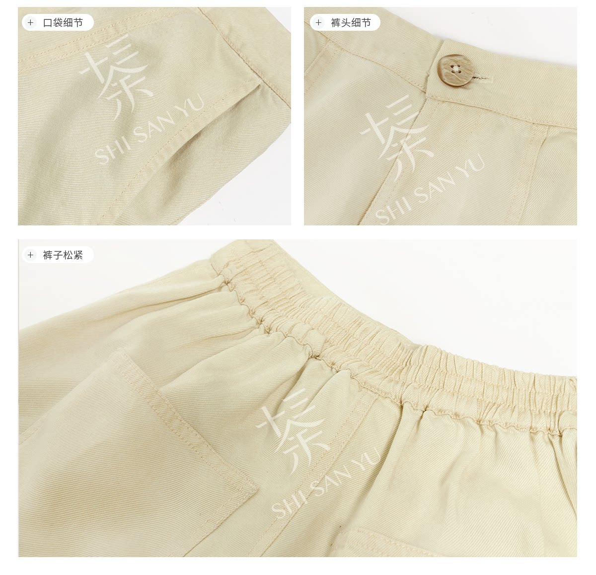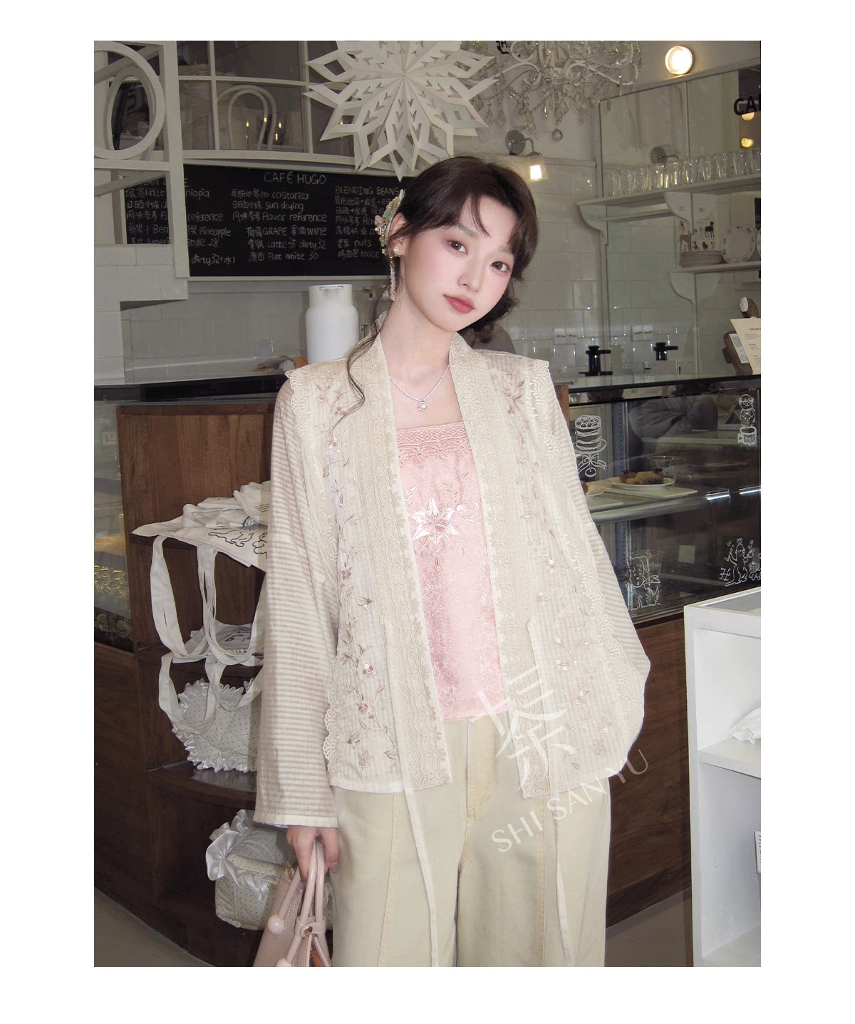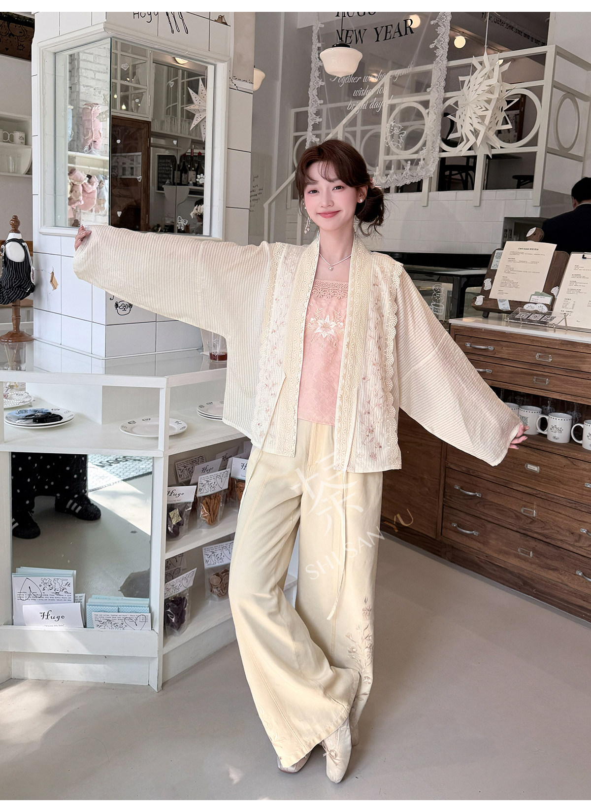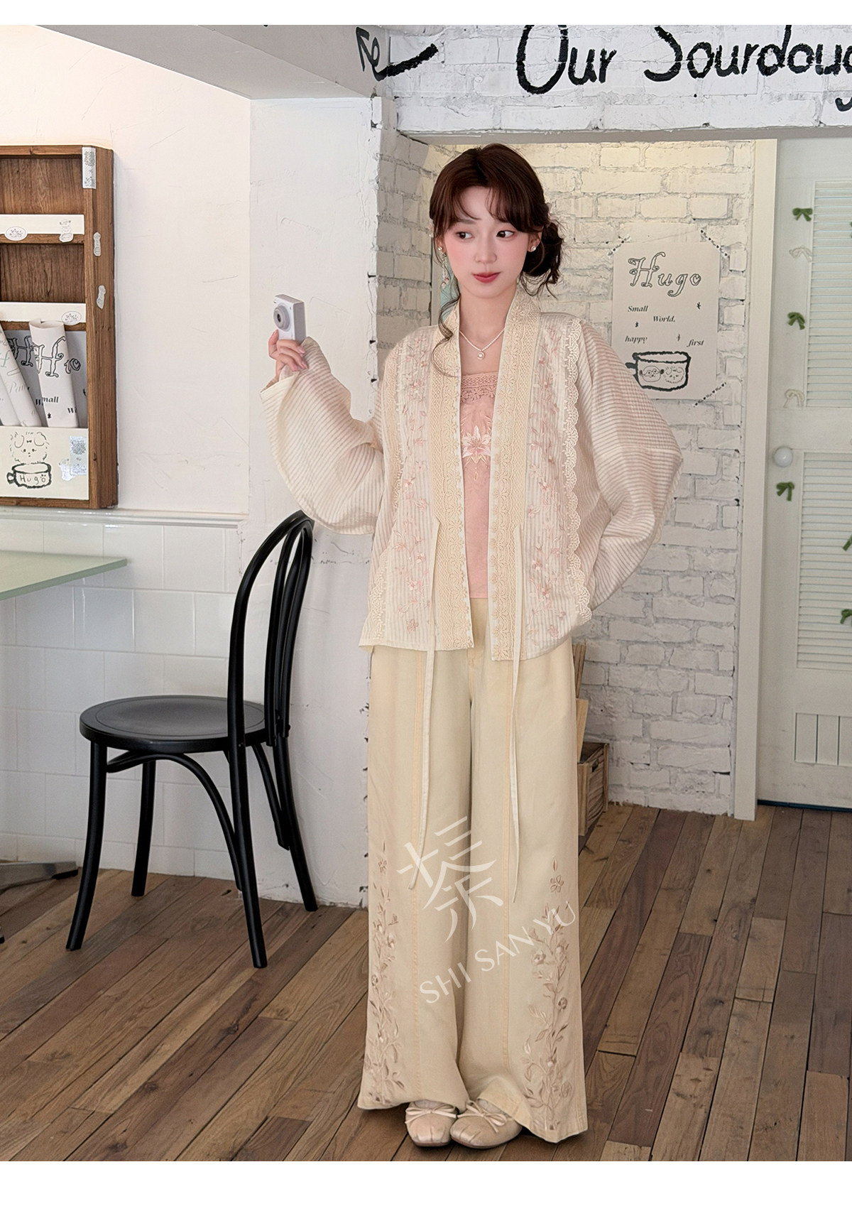 テンセルの対襟トップスとベージュの刺繍デニムワイドパンツ 十三余[雪芽]