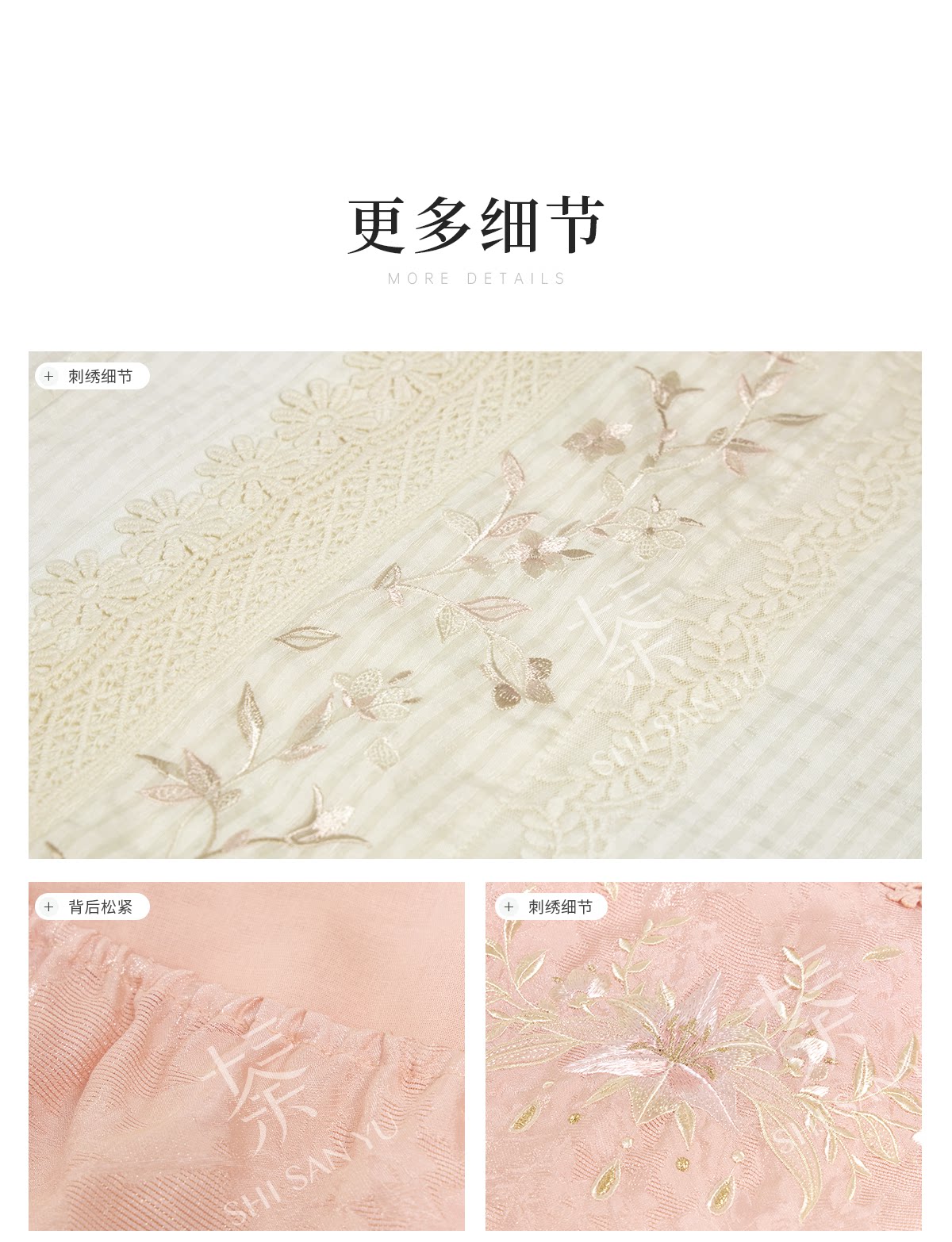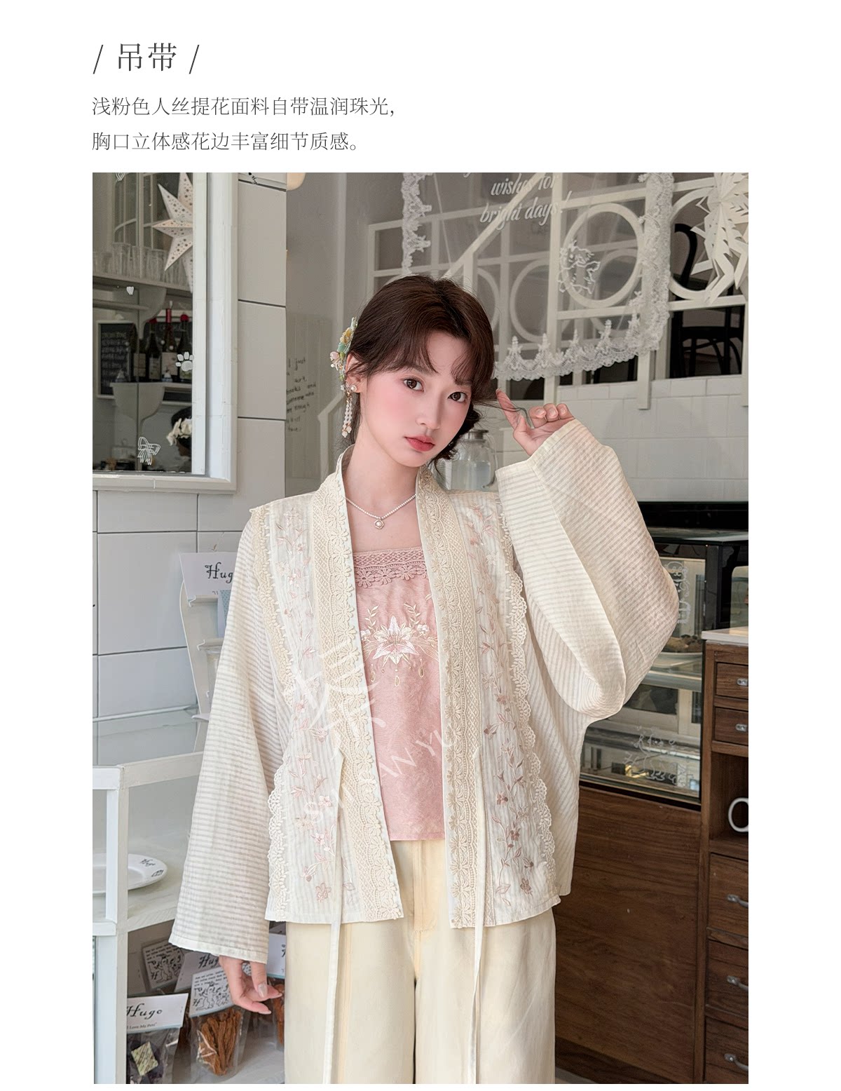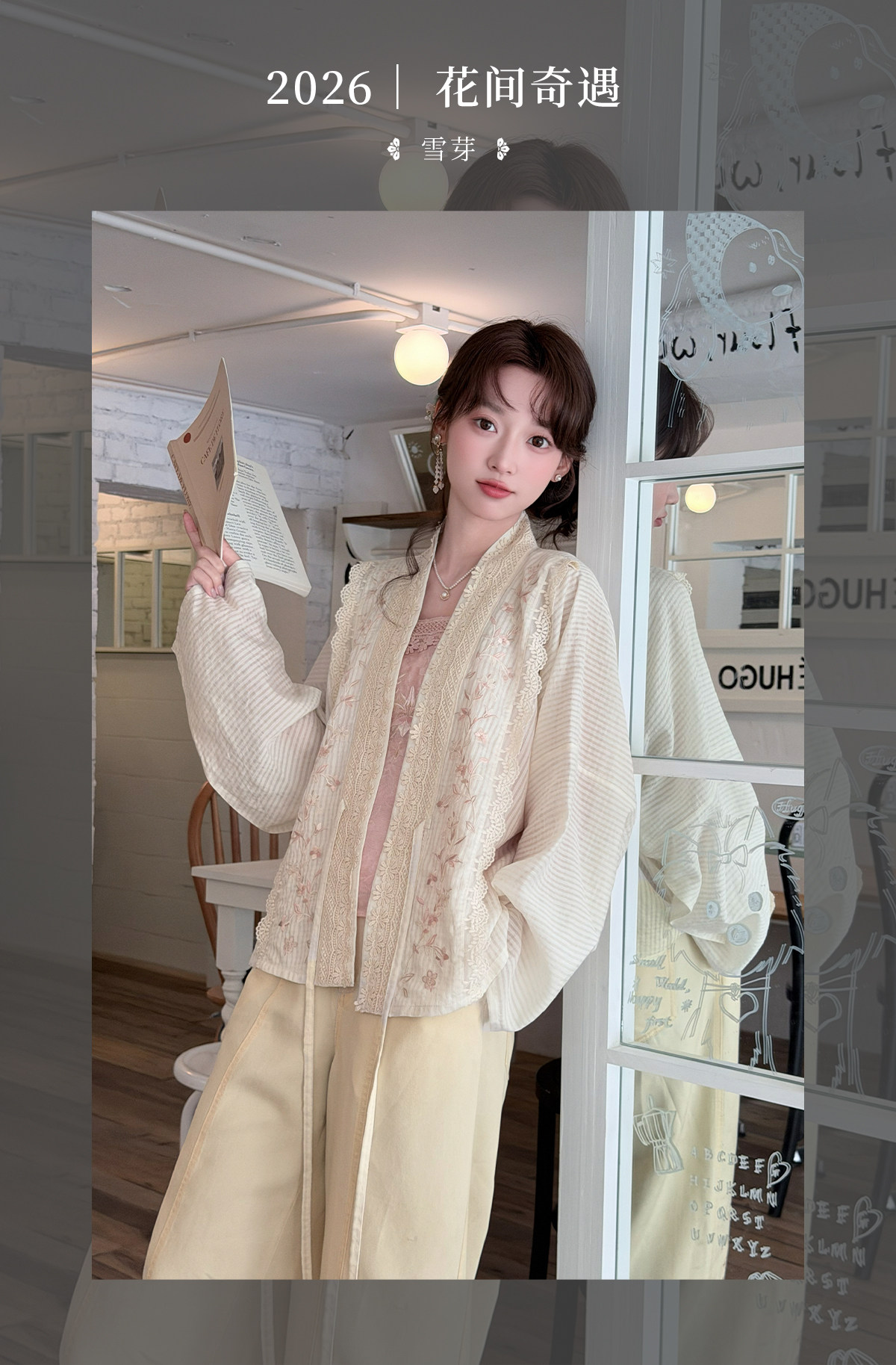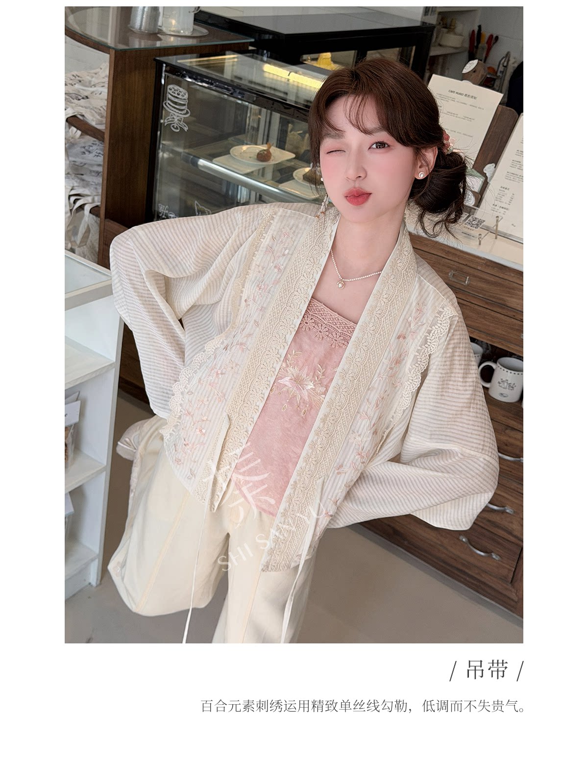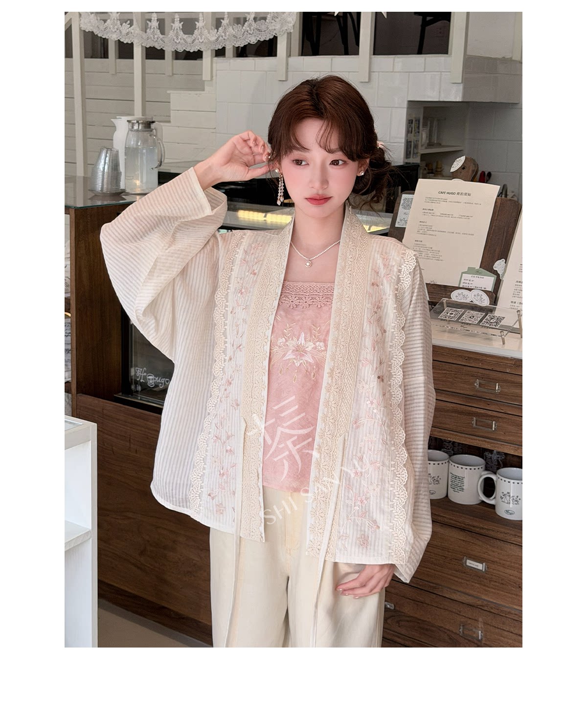 テンセルの対襟トップスとベージュの刺繍デニムワイドパンツ 十三余[雪芽]