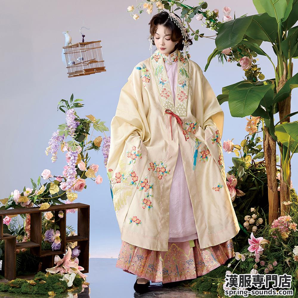 晩明漢服 披風・立ち襟大襟袄・馬面裙 刺繍が彩る春の伝統装 花朝记|花间灵玑鹦鹉