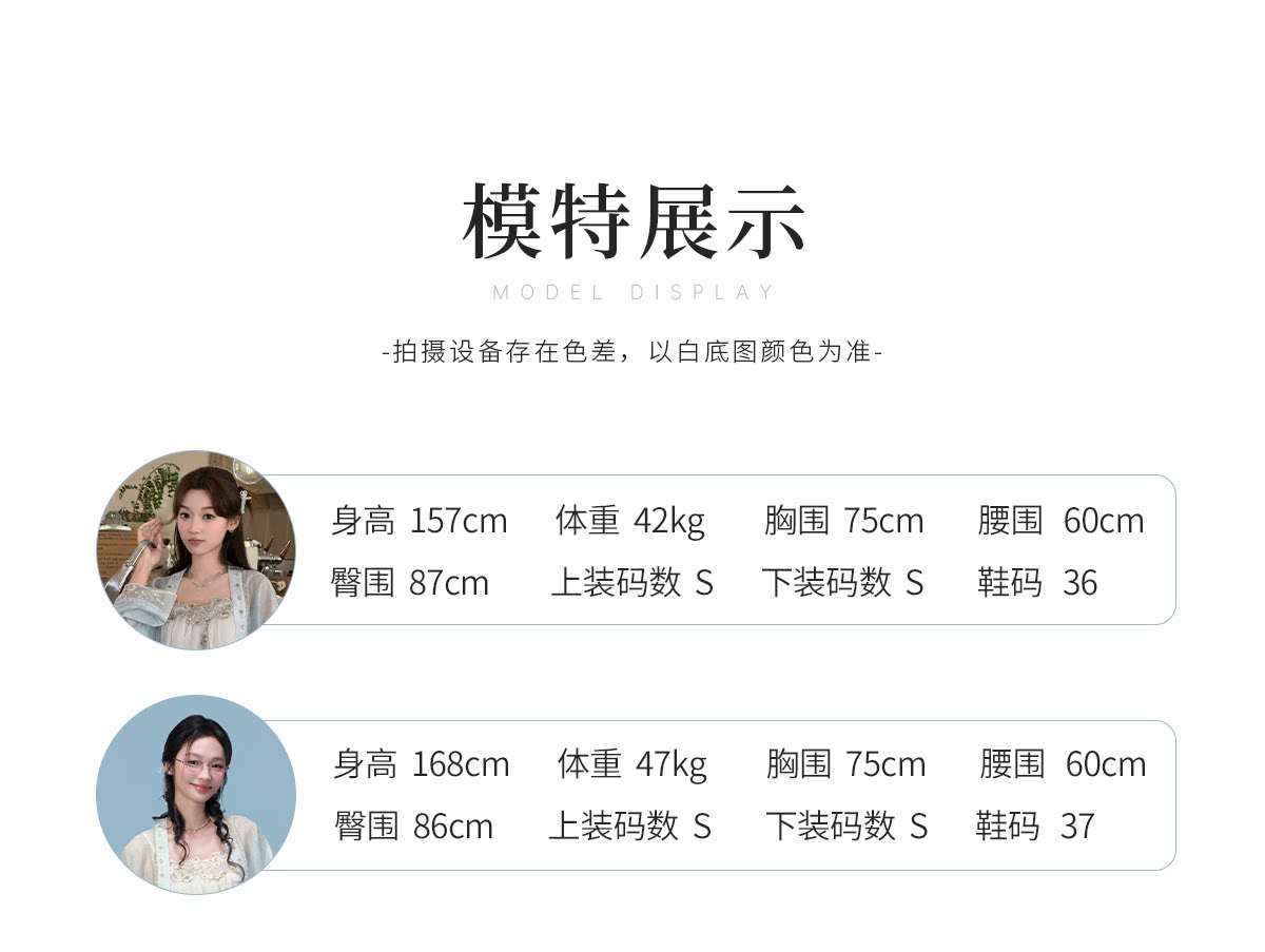 モデル 身長157cm、体重42kg、バスト75cm、ウエスト60cm、ヒップ87cm、試着サイズ:S
